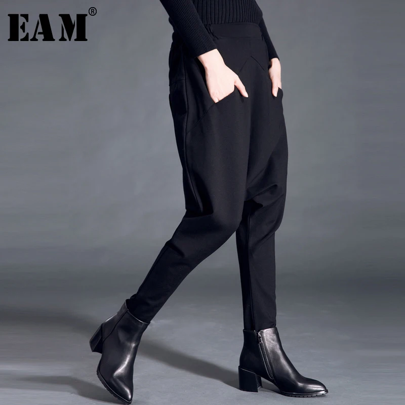 Name: Harem-Pants EAM Pocket Split-Joint Women Trousers Loose Black High-Elastic Fashion Waist